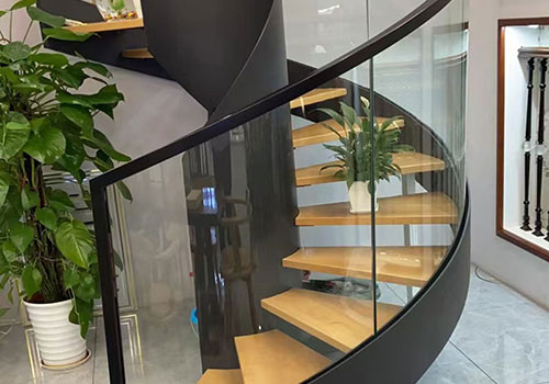 弧形旋轉樓梯最常見的是圍繞中心柱分布踏板,整體平面為圓形,平臺和樓梯臺階為扇形平面,此案例為玻璃扶手,實木踏板,簡約實用。