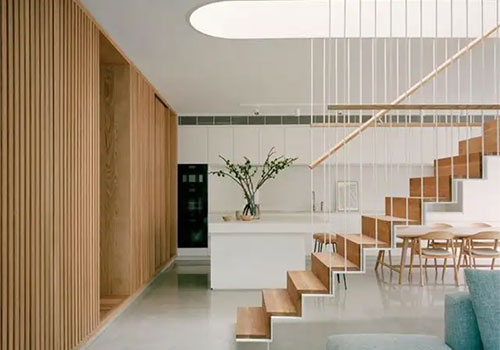 此極簡(jiǎn)風(fēng)格家居室內(nèi)懸浮樓梯采用木質(zhì)和其他輕質(zhì)材料懸掛在半空中讓樓梯像一件精致的藝術(shù)品。既能節(jié)省空間,又能起到裝飾作用,也滿足了用戶的需求。